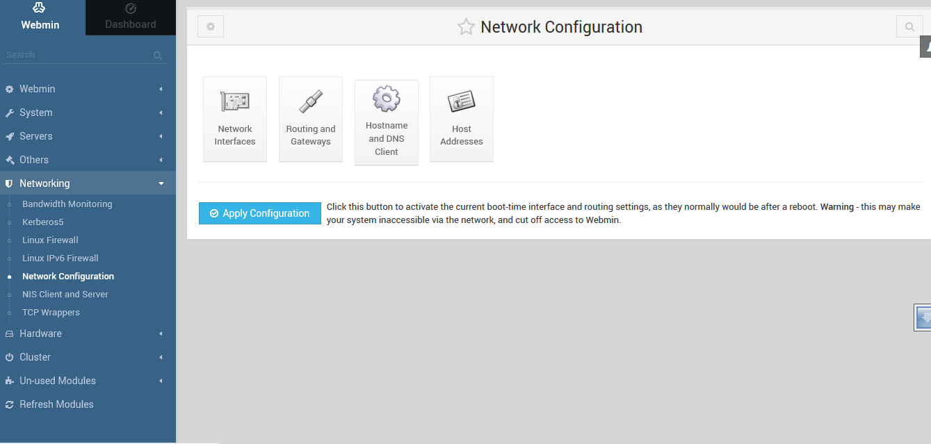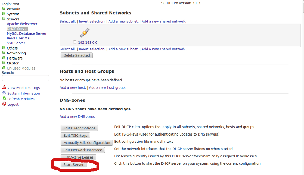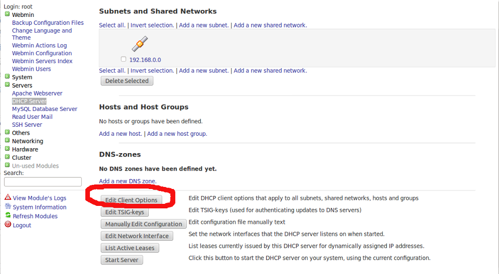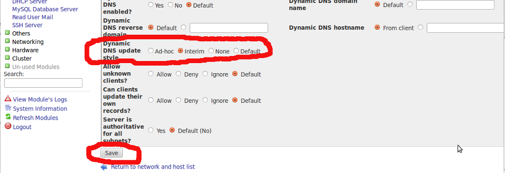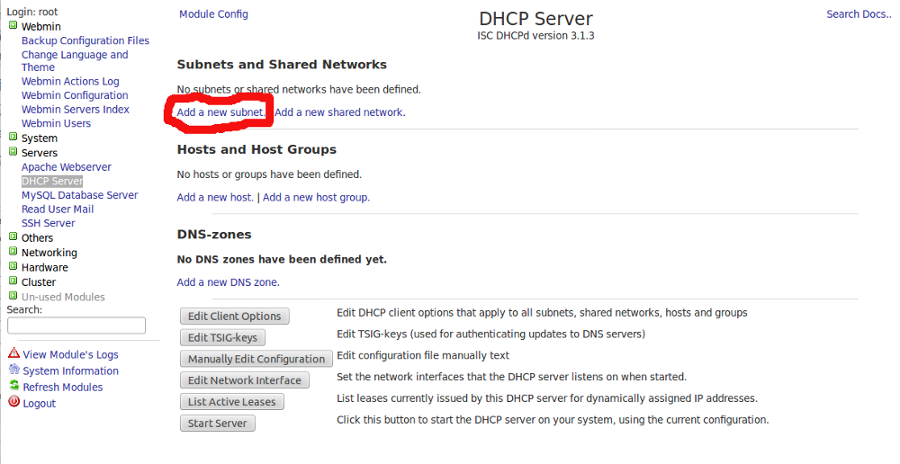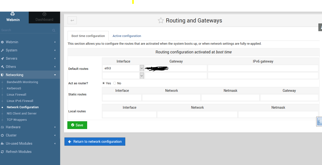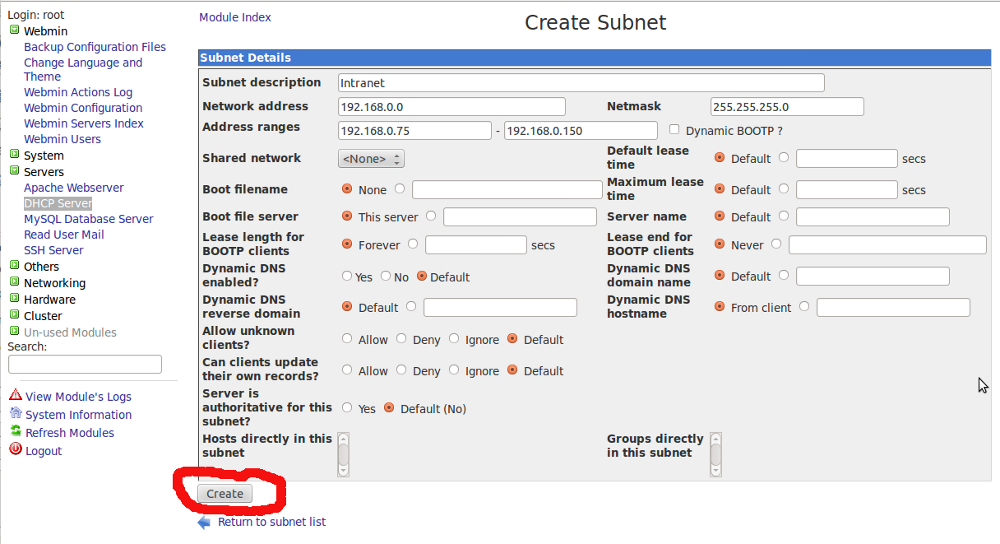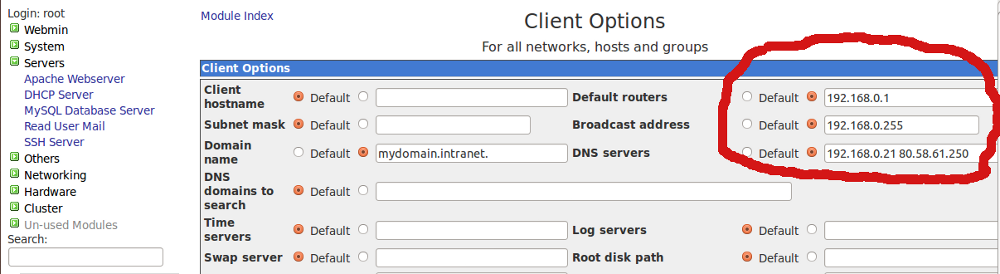 Create a Linux Router with DHCP services Rumi, August 5, 2018August 5, 2018 It’s pretty easy to build a Linux router even on a virutal machine. I’ve used virtualbox to create a LAN NAT router with DHCP services using webmin. However, I’m not going to cover on how to use a virtualbox VM 🙂 Let’s create the NAT Router first. On Webmin go to Networking > Network Configuration > Routing and Gateways Fig-1 Select right ethernet interface on Default Route Fillup the correct gateway Enable “Act as a Router” On Networking > Linux Firewall > Select “Reset Firewall” Do network address translation on external interface: <select your WAN interface> Click Setup Firewall Finally “Apply Configuration” Your Linux NAT router is now ready 🙂 Now Setting up simple DHCP Server using Webmin Install DHCP server Option A): Centos 5.8 # yum install dhcp Set the DHCP service to start on boot # chkconfig dhcpd on Start DHCP service # service dhcpd start Option B): Ubuntu 10.04 sudo apt-get install dhcp3-server 2.- Setting up My network design is the following: Network name: Intranet Network adsress: 192.168.0.0 Netmask: 255.255.255.0 Address range: 192.168.0.75 – 192.168.0.150 (DHCP server can give 75 IPs) Domain: mydomain.intranet Default routers: 192.168.0.1 Broadcast address: 192.168.0.255 DNS servers: 192.168.0.21 80.58.61.250 192.168.0.21 -> DNS Server Local (our own DNS Server, within our network) 80.58.61.250 -> DNS Server External (ISP company) Now do the following: Access webmin from any browser (use your own IP number): https://your_IP:10000 First refresh modules: Webmin -> Webmin Configuration -> Refresh Modules Servers -> DHCP Server – > Add a new subnet. Fill boxes and click create Servers -> DHCP Server -> Edit Client Options Fill boxes (Antención with dot at the end of intranet!!!!!!!!) on the same screen mark Interim in “DNS update style” and click save Finally start DHCP server Administrations Configurations (Linux) DHCPWebmin